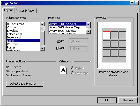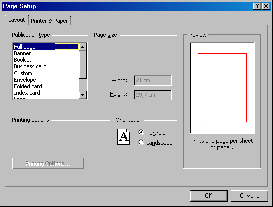 Здесь мы по умолчанию попадаем на вкладку Layout (Схема, План). В ней три верхних поля — Publication type (Тип публикации), Page size (Размер страницы) и Preview (Просмотр). С последним все совершенно ясно: в зависимости от назначений вкладки мы будем наблюдать, как изменяется в поле просмотра вид страницы, которую назначаем. С Размером страницы, кажется, тоже все в порядке: каков размер, такова и страница. А вот по Типам публикаций программа Publisher далеко обставила всех конкурентов. Здесь страницы и публикации действительно на все случаи жизни. Только в CorelDRAW я наблюдал аналогичный подход, но там типе изображений значительно меньше. Ведь тут и внутри изображения кроется больше количество вариантов, и каждый программой зафиксирован, каждый имеет мест быть, под него существуют шаблонные разработки!