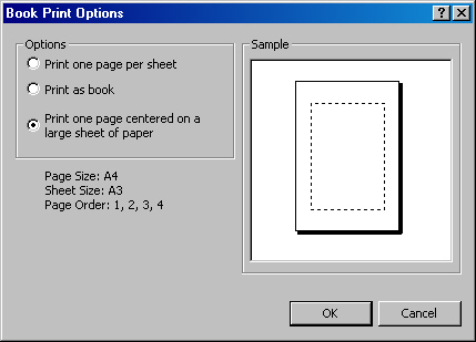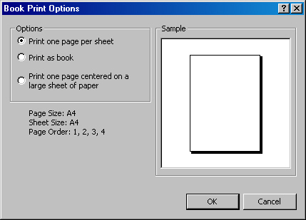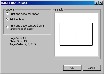 На этом рисунке вы видите возникающий диалог Изменения Порядка Страниц. Он называется Параметры Книжной Печати (Book Print Options). Здесь два поля: Options (Параметры) и Sample (Образец). По умолчанию установлен флажок в строке Print one page per sheet (Печать одной страницы на листе). Соответственно Образец, он же Просмотр, так нам и показывает. А вот на рисунке 24 — другая опция: Print as book (Печатать как книгу) — фактически печать книжного разворота. Обратите внимание, ниже поля строк параметров запись также меняется: там отражается, в каком порядке печатаются страницы. Именно здесь порядок интересный — разворот листа с двух сторон так и печатается — 4,1,2 и 3 страницы (это указаны номера страниц).