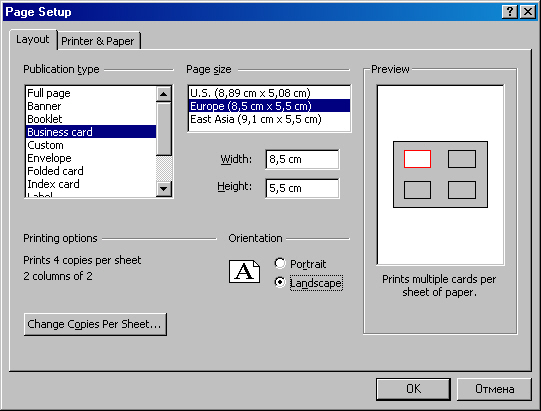 визиток на странице. Но то же кроется и в поле Ориентации Страницы. На рисунке 31 вы это видите.