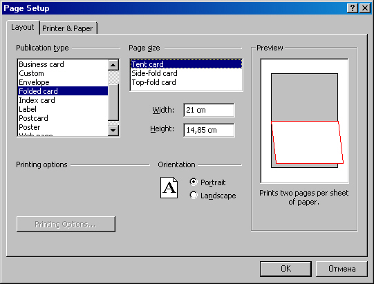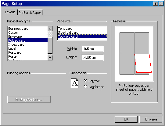 На рисунке 33, где изображена Складная Карта, вы видите Портретную ориентацию страницы. И подтип этого вида карты — Палатка (Tent card). Я бы назвал — Шалаш.