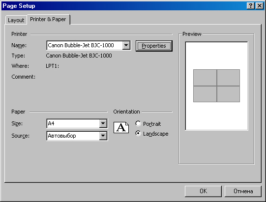 Нас ждет интереснейшая опция Page Setup... (Установка, Параметры Страницы...). Откроем эту опцию...