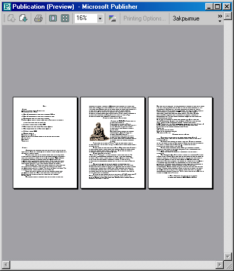 Здесь, как видите, нет никаких меню, отсутствует, естественно, и Строка командных меню. Зато есть Панель инструментов. Она общая, в ней собрались понемногу все свойства и функции — и навигации, и масштабирования, и правки, и даже печати. Кнопки, которые стоят в ряду самыми первыми, листают страницы: с предыдущей на последующую и наоборот. Просмотр — по желанию, без назначения конкретного масштаба, может быть грубо изменен. К примеру, вы можете назначить Whole Page (Вся Страница) — соответственно просмотрите только одну страницу. Или — Multiple Pages (Несколько Страниц). Это удобно, чтоб окинуть взором, как одна страница сочетается с другой, и нет ли где композиционных промахов, которых, пока рассматриваешь каждую страницу журнала (к примеру), можно не заметить. Страница на рисунке 62 — это «Вся Страница», просмотр по умолчанию. Назначим Несколько Страниц и взглянем, что получится.