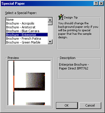 Следующая опция — Special Paper... (Специальная Бумага...). Здесь через диалог программа предлагает вам, если пожелаете, принять к дизайну вашей страницы некий заранее разработанный специалистами и дизайнерами разработчик Publisher набор готовый подложек для страницы в виде определенного характерной фона или рамки и т. д. Они называются достаточно интересно — стиль Аристократ, к примеру. Я выбрал стиль Брошюра — Энтерпрайз. И вот что получилось: