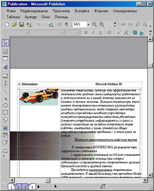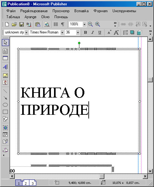 Кстати сказать, переходя на третью страницу со страницы первой, где мы толь ко что были, мы увидим: программа показывает нам третью страницу в том же точно масштабе, что мы рассматривали первую. В этом отличие Publisher от PageMakei где общий для всех страниц масштаб надо задавать специально, иначе каждая страница сохраняется в том масштабе, в котором ее в последний раз посматривали ил правили. Здесь это неудобство ликвидировано. То есть, наоборот, его здесь и не существовало.