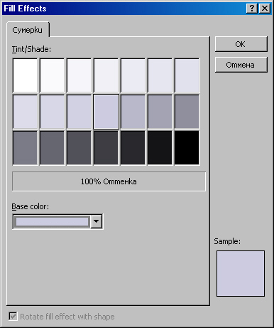 Но пока взглянем на последнюю опцию меню Color. Это Fill Effects... (Эффекты Заливки...). Правда, трудно назвать это уж очень большими эффектами. Скорее речь идет просто о Тоне выбранного цвета. Градацию тонов и соответственно возможность выбрать соответствующий вашим задачам тон цвета вы видите на рисунке 28.