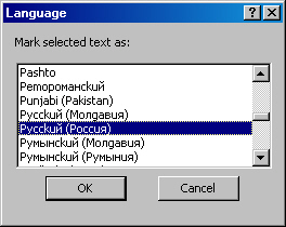 Ну, выбрали язык и говорим ОК. Теперь проверка орфографии пойдет у нас с русским словарем. Не перепутать бы: не с молдавским русским, а с русским русским!