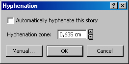 Как видим, здесь определено не два или три знака от слова, которые должны остаться на прежней строчке или перекочевать на новую строку, как это устроено в QuarkXPress, а назначена область переноса, как это проделано в Word. Область переноса в Publisher по умолчанию — 0,639 см. Ставим флажок в верхнем окошке для флажка против строки Automatically hyphenate this story (Автоматическая расстановка переносов в материале). Жаль, что нет строки «Максимальное число переносов подряд», которая есть в Microsoft Word. Некрасиво, если все строчки в книге состоят из переносов. Жаль, что такой опции нет в Publisher: где ж ей быть, как не в верстальной программе?