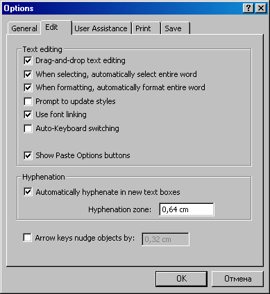В самом верху вкладки — поле Text editing (Редактирование Текста). В этом поле собраны строки: Drag-and-Drop text editing (Перетаскивать и Вставлять текст для правки), When selecting, automatically select entire word (При выделении автоматически выбирать все слова), When formatting, automatically format entire word (При форматировании автоматически форматировать все слова), без флажка — Prompt to update styles (Быстрое добавление стилей), Use font linking (Пользоваться связыванием шрифтов) и без флажка — Auto-Keyboard switching (Автовключение Клавиатуры).