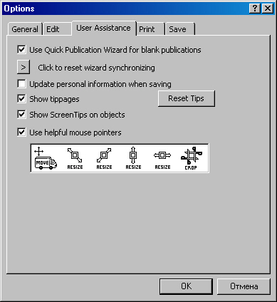 Первая строка — Use Quick Publication Wizard for blank publications (Использовать Мастера Быстрых Публикаций для создания публикации с пустого листа).