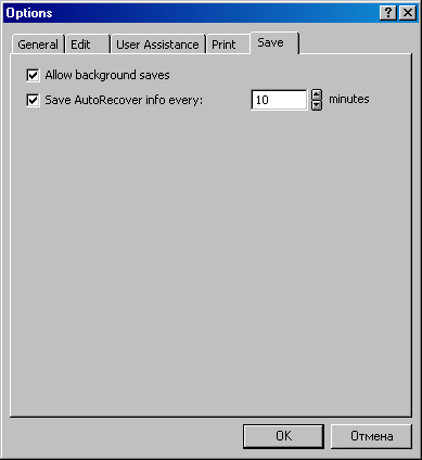 Последняя вкладка — Save (Сохранение). Здесь всего две опции — Allow background saves (Допускать фоновое сохранение) и Save AutoRecover info every: 10 min (Автосохранение камедые 10 минут).