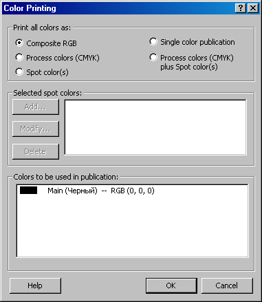 Здесь в верхнем поле, которое называется Print all colors as: (Печатать все цвета как:), перечислены все способы представления цветов и цветовые системы, которые используются программой Publisher.