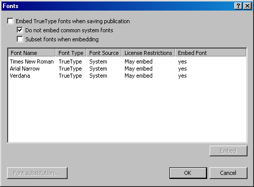 Здесь, мы видим, нам предлагается полный список использованных по разным поводам в этой публикации шрифтов (их немного) и рекомендуется встроить их в наш файл. Это удобно тем, что в Сервисном бюро или в Типографии, куда попадет публикация, не возникнет вопросов, поскольку все шрифты, которых там вдруг может не оказаться, вы принесете вместе с файлом. Услуга великолепная. Правда, программы-приложения так делают давно, но вот разглядеть полный список использованных шрифтов, кажется, больше ни одна программа, кроме CorelDRAW, не дает. Еще одно удобство Publisher.