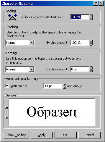 межсимвольный интервал. Рассмотрим же опции диалогового