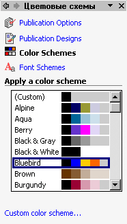 Это уже знакомый нам Докер. В нем мы «исходили» все поля. И обратите внимание: среди гиперссылок, собранных в верхней части Докера, как раз те, чьи опции следуют за рассматриваемой в меню Format. Это опции Publication Designs... (Дизайны Публикаций...), Color Schemes... (Цветовые Стили...) и Font Schemes... (Стили Шрифтов...). Каждая из этих гиперссылок откроет нам соответствующий Докер. Вот они, на предлагаемых вам рисунках 23-25.