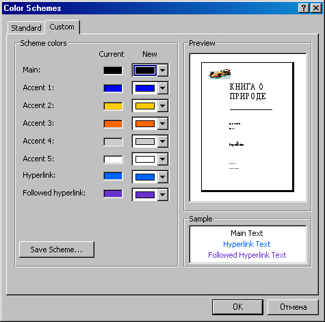 Диалог Выбора цвета вызывается другой гиперссылкой — Custom colo scheme... (Обычная цветовая схема...). В нем собраны плашечные цвета. К вашим услугам две вкладки — Standard и Custom.