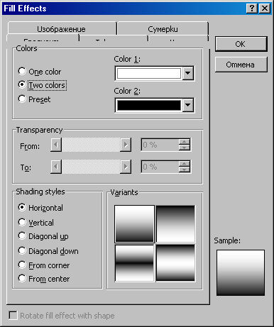 Честно говоря, разглядывать и выбирать варианты можно часами. Можно забыть и о работе, настолько богаты возможности Publisher в этом отношении. Богаты не в смысле того, чтоб забыть о работе, а в смысле создания разного рода заливок, используя настройки лишь одной вкладки диалога. Во-первых, во вкладке существует верхнее поле Colors (Цвета). На рисунке пока все неактивно, но поставим флажок в верхней строчке One color (Один цвет) и увидим, что в поле появились новые настройки — Colorl и движок Темно — Светло.