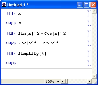 Пока не стоит обращать внимание на то, как получен рис. 1.15 — это окно реально работающей системы Mathematica. Уже при рассмотрении простейшего примера, представленного на этом рисунке, можно сделать несколько характерных выводов. Прежде всего видно, что при выводе неопределенной переменной х мы получаем просто имя этой переменной. Функции sin(х) и cos(х) в системе Mathematica обозначаются как Sin [х] и Cos [х]. Само по себе выражение sin(х) 2 + cos(х) 2 просто повторяется, а для его вычисления используется функция Simplify (упростить), аргументом которой является знак %, означающий подстановку предшествующего выражения. Два знака % можно использовать для подстановки предшествующего предшествующему выражению и т. д. Для вычисления строки ввода надо нажимать клавиши Shift+Enter, нажатие же одной клавиши Enter просто переводит строку в области ввода, именуемой также ячейкой ввода.