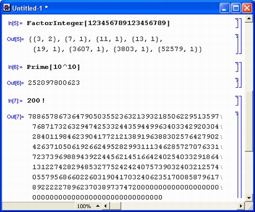Первая из приведенных операций дает разложение целого числа на простые множители с помощью функции Factorlnteger. Они представлены списками (в фигурных скобках) из двух чисел. Первое число — это множитель, а второе — число его повторений. В считанные секунды Mathematica 4 находит десятибиллионное простое число с помощью функции Prime. Другой характерный пример целочисленных операций — вычисление факториалов (вы можете запросто получить факториал 10 000, но ради сокращения места при описании примера в нем вычислено значение 200! Последний пример показывает отсутствие ошибок при работе с большими целыми числами — и это несмотря на то, что при его выполнении и впрямь дважды вычисляется факториал числа 10 000.