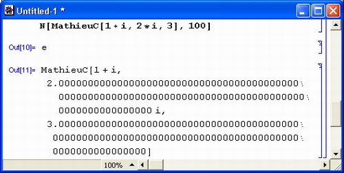 Здесь использована одна из самых распространенных функций системы Mathematica — N[expr, n], дающая результат вычисления выражения ехр r с точностью до n знаков после десятичной точки. Константы я и е вычислены с 500 верными знаками, а новая функция Матье (MathieuC) — с точностью до 200 знаков. Однако в системе Mathematica n может достигать миллиона и более. Ограничения по разрядности чисел и их верхнему и нижнему пределам практически отсутствуют.