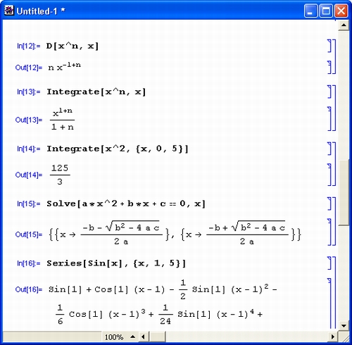 Разумеется, роль систем символьной математики далеко не исчерпывается приведенными выше примерами. Эти системы способны преобразовывать сложнейшие алгебраические выражения, находить аналитические решения сложных систем линейных, нелинейных и дифференциальных уравнений, манипулировать со степенными многочленами, вычислять производные и интегралы, анализировать функции, находить их пределы и т. д. Это видно уже из примеров, представленных на рис. 1.6 .