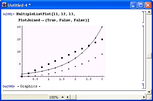 Эта опция может быть представлена и со значением в виде списка. Например, ее применение в виде PlotJoined->{True, False, False} означает, что точки первой кривой соединяются линиями, тогда как точки второй и третьей кривых линиями не соединяются. Рисунок 14.54 поясняет этот способ построения графиков.