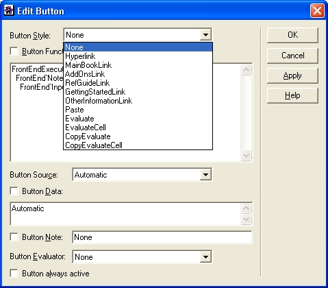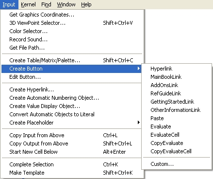 При создании сложных документов для диалогового режима работы с системой Mathematica иногда полезно создание кнопок. Оно выполняется командой Create Button. Она выводит подменю, содержащее небольшое число типов кнопок. Например, кнопка типа Evaluate Cell служит для создания ячейки, исполняющей вычисления. Она выглядит как прямоугольник: