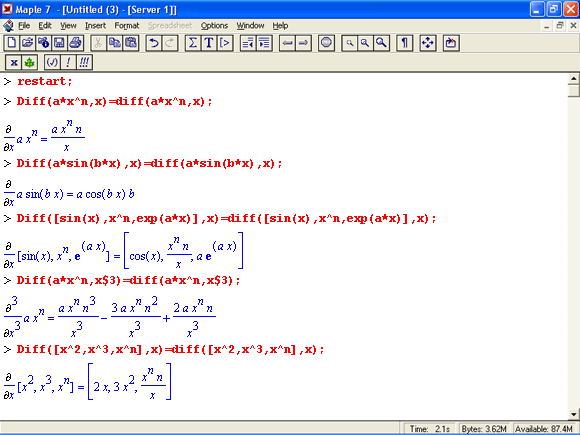 Вычисление производных функций fn(x) = dfn(x)/dxn n-го порядка — одна из самых распространенных задач математического анализа. Для ее реализации Maple 7 имеет следующие основные функции: