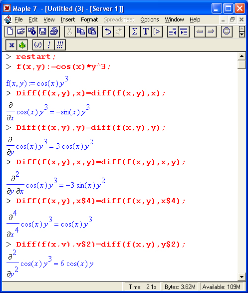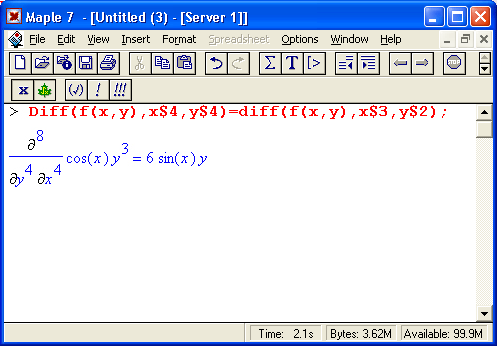 Здесь а — дифференцируемое алгебраическое выражение, властности функция f(xl. x2, .... хn) ряда переменных, по которым производится дифференцирование. Функция Diff является инертной формой вычисляемой функции diff и может использоваться для естественного воспроизведения производных в документах. Первая из этих функций (в вычисляемой и в инертной форме) вычисляет частные производные для выражения а по переменным xl, х2, ..., .хn. В простейшем случае diff(f(x),x) вычисляет первую производную функции f(x) по переменной х. При n, большем 1, вычисления производных выполняются рекурсивно, например diff (f (х), х, у) эквивалентно diff(diff (f(x), х), у). Оператор $ можно использовать для вычисления производных высокого порядка. Для этого после имени соответствующей переменной ставится этот оператор и указывается порядок производной. Например, выражение diff (f(x) ,x$4) вычисляет производную 4-го порядка и эквивалентно записи diff (f (х) ,х,х,х.х). A diff (g(x,y) ,x$2,y$3) эквивалентно diff(g(x,y),x,x.y,y,y) ;