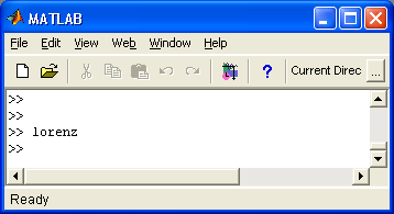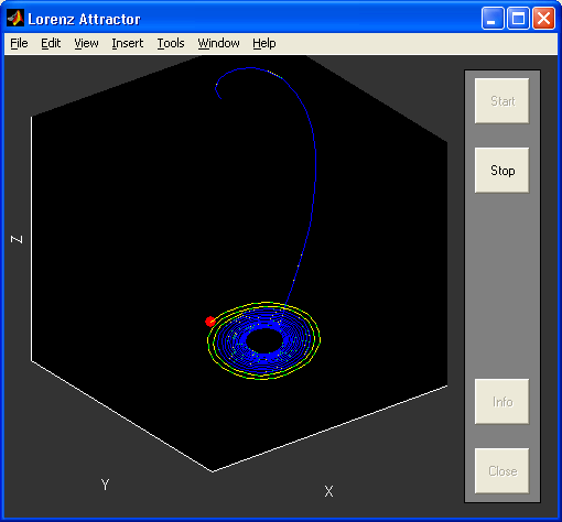 На рис. 4.3 показан пример визуализации динамического процесса в так называемом аттракторе Лоренца (пример lorenz) — колебательной системе, создающей хаотические и довольно замысловатые колебания. Наиболее наглядна их визуализация с помощью трехмерного фазового портрета колебаний, который приведен на рис. 4.3. К сожалению, на рис. 4.3 показана лишь завершающая стадия — на экране можно реально видеть движение образующей точки во времени и убедиться в своеобразной хаотичности колебаний. Для запуска анимации надо нажать кнопку Start (Пуск) окна графики.