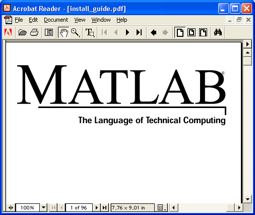 В качестве примера работы с электронными документами формата PDF рассмотрим просмотр книги-справочника, предназначенной для начального знакомства с системой MATLAB (Getting Started with MATLAB) (Начинаем работу с MATLAB). Его титульная страница показана на рис. 4.12. Заметим, что она появляется после загрузки программы Acrobat Reader (временное окно этой программы не показано).