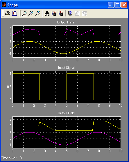 На рис. 4.17 приведен пример просмотра одного из простых примеров — моделирования динамической системы второго порядка, описываемой нелинейными дифференциальными уравнениями Ван-дер-Поля. Сверху показана блок-схема моделируемого объекта, а снизу — результат моделирования его работы. Для пуска моделирования в панели инструментов окна системы Simulink нажимается кнопка пуска с изображением треугольника.