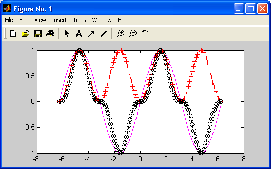 » plot(x,y1,'-m',x,y2.'-.+r',x,y3,'--ok')