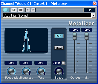 Плагин Metalizer (рис. 13.14) позволяет получить эффект "металлического" звучания. По сути дела он представляет собой резонансный фильтр, центральная частота которого перестраивается по периодическому закону. Необычное звучание достигается также тем, что фильтр охвачен цепью обратной связи.