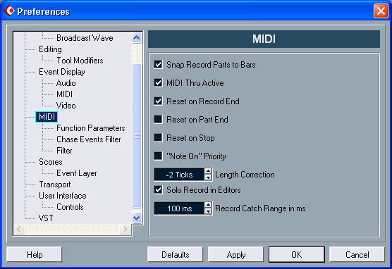 В поле ввода Record Catch Range in ms вы можете в миллисекундах выбрать интервал времени опережения фактического включения режима записи по отношению к моменту, соответствующему положению левого локатора. Это позволяет избежать досадных случаев пропуска записи первой ноты, которые могут происходить из-за того, что вы сыграли ее чуть раньше, чем указатель текущей позиции достиг левого локатора.