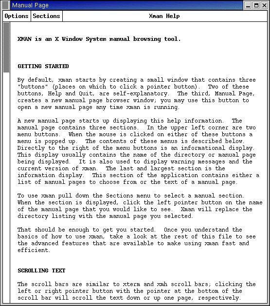Чтобы открыть окно xman, показанное на рис. 13.2, щелкните на кнопке Manual Page (Страница руководства). Сначала открывается файл справки окна, у которого есть два меню: Options (Параметры) и Sections (Разделы).