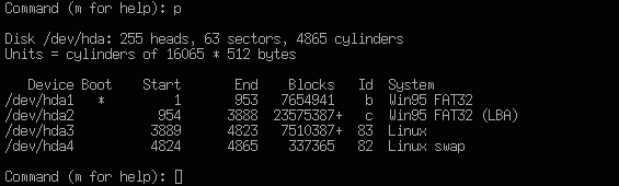 fdisk активизируется командой р. Выводимая таблица показана на рис. 5.3.