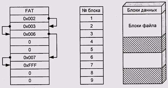 Отчасти похожее решение было реализовано в MS DOS и DR DOS. Эти системы создают на диске таблицу, называемую FAT (File Allocation Table, таблица размещения файлов). В этой таблице каждому блоку, предназначенному для хранения данных, соответствует 12-битовое значение. Если блок свободен, то значение будет нулевым. Если же блок принадлежит файлу, то значение равно адресу следующего блока этого файла. Если это последний блок в файле, то значение — OxFFF (рис. 11.10). Существует также специальный код для обозначения плохого (bad) блока, не читаемого из-за дефекта физического носителя. В каталоге хранится номер первого блока и длина файла, измеряемая в байтах.