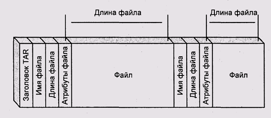Наиболее простой файловой системой можно считать структуру, создаваемую архиватором системы UNIX — программой tar (Tape ARchive — архив на [магнитной] ленте). Этот архиватор просто пишет файлы один за другим помещая в начале каждого файла заголовок с его именем и длиной (рис. 11.5). Аналогичную структуру имеют файлы, создаваемые архиваторами типа arj; в отличие от них, tar не упаковывает файлы.