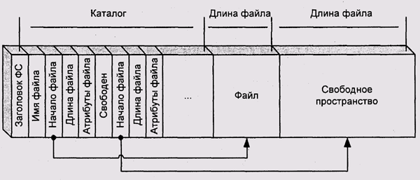 Для того чтобы не заниматься при каждом новом поиске просмотром всего устройства, удобнее всего разместить каталог в определенном месте, например в начале ленты. Наиболее простую, из знакомых автору, файловую систему такого типа имеет ОС RT-11. Это единственная известная автору файловая система, которая с одинаковым успехом применялась как на лентах, так и на устройствах с произвольным доступом. Все более сложные ФС, обсуждаемые далее, используются только на устройствах произвольного доступа. В наше время наиболее распространенный тип запоминающего устройства произвольного доступа — это магнитный или оптический диск, поэтому далее в тексте мы будем называть такие устройства просто дисками — для краткости, хотя такое сокращение и не вполне корректно.