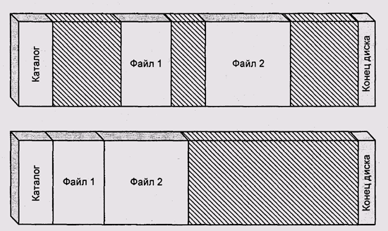 2. 2. При хаотическом создании и удалении файлов возникает проблема фрагментации свободного пространства. Для ее решения существует специальная программа SQUEESE (сжать [диск]), которая переписывает файлы г так, чтобы объединить все свободные фрагменты (рис. 11.8). Эта программа требует много времени, особенно для больших дисковых томов, и потенциально опасна: если при ее исполнении произойдет сбой системы (а с машинами третьего поколения такое случалось по нескольку раз в день), то значительная часть данных будет необратимо разрушена.