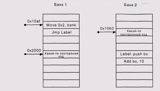 состоит минимум из двух команд: переключения банка и собственно перехода.