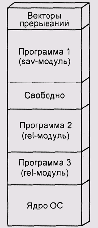 Рис. 3.5. Распределение памяти в RT-11 с одним загруженным sav-файлом и двумя rel-файлами |