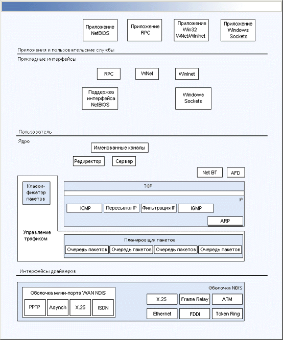Поддержка промежуточных драйверов (требуется для широковещания PC, виртуальных ЛВС, планирования пакетов дли QoS и для поддержки сетевых устройств IEEE-1394) |