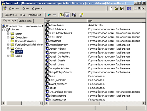 | Builtin | Содержит встроенные локальные группы: Account Operators (Операторы учета), Administrators (Администраторы), Backup Operators (Операторы архива), Guests (Гости), Pro-Windows 2000 Compatible Access (Совместимый с пред-Windows 2000 доступ), Print Operators (Операторы печати), Replicator (Репликатор), Server Operators (Операторы сервера) и Users (Пользователи) |