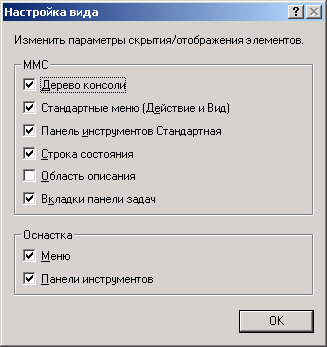 | 8. | На рис. 6.10 показана созданная в результате панель задач. В данном окне консоли панель структуры отключена— аналогично тому, как это было сделано в предыдущем разделе. Для удаления лишних меню и панелей инструментов снимите соответствующие флажки в окне Настройка вида (Customize View) (опции Вид (View) | Настроить (Customize) на панели инструментов или команда Вид | Настроить в контекстном меню созданной панели задач). |
