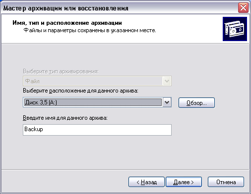 Если система обнаружит на вашем компьютере устройства для резервного копирования, то в списке Тип носителя (Backup media type) появится соответствующий элемент. Достаточно часто в качестве носителя для резервного копирования выступает стример - устройство для хранения информации на магнитной ленте. В домашних условиях чаще используются устройства для работы с магнито-оптическими дисками или устройства записи на компакт-диски. Если таких устройств не обнаружено, то первый список диалога будет недоступен, и архив можно будет создать на дискете или на другом жестком диске компьютера, информация на котором не требует архивации.