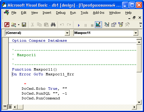 Даже в локализованных версиях Access окно редактора кода VBA, а также все другие диалоговые окна, составляющие среду программирования VBA, традиционно не локализуются. Поэтому все рисунки в этом разделе главы, а также экранные термины (названий команд меню, диалоговых окон и т. д.) приводятся в нелокализованном варианте.