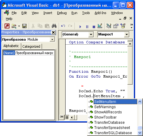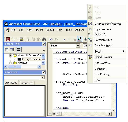 Команда Definition позволяет также быстро открыть окно Object Browser и посмотреть описание нужного свойства, метода или объекта приложения. Для этого нужно установить курсор на интересующий объект, свойство, метод и нажать комбинацию клавиш <Shift>+<F2>.