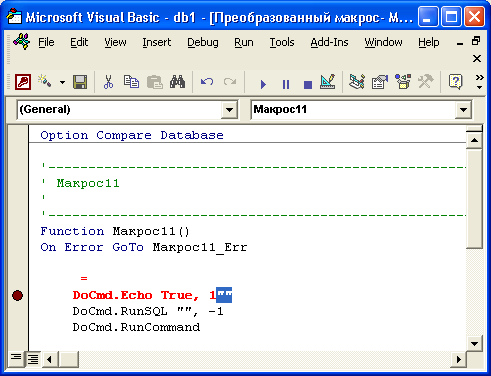 строки, произойдет останов, а на экране появится окно редактора кода, в котором