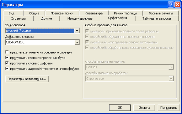 (AutoCorrect Options) открывает диалоговое окно, в котором задаются